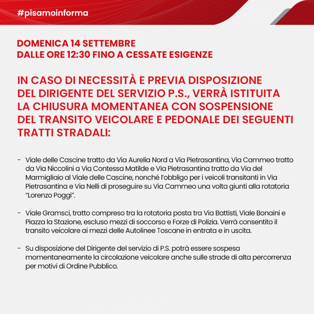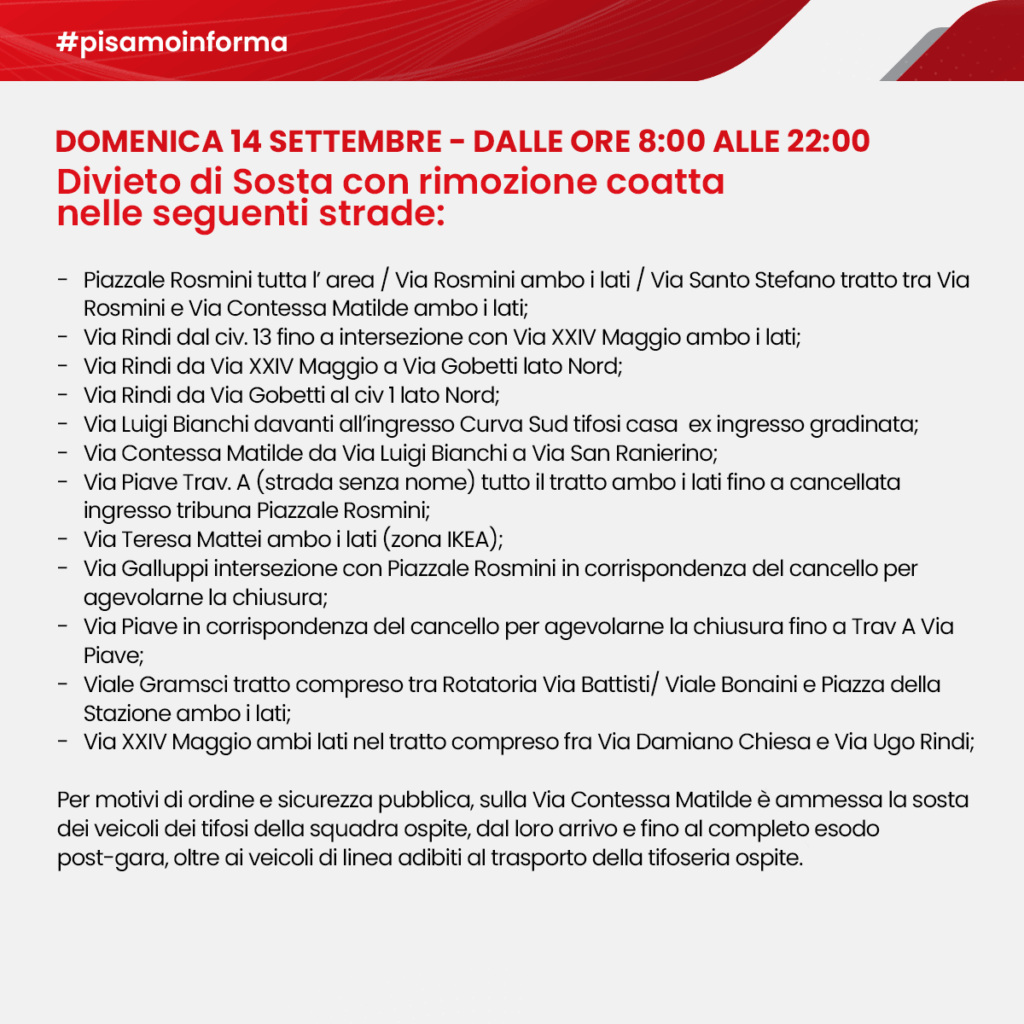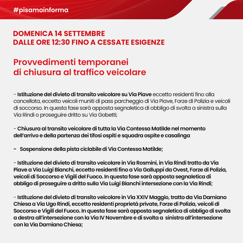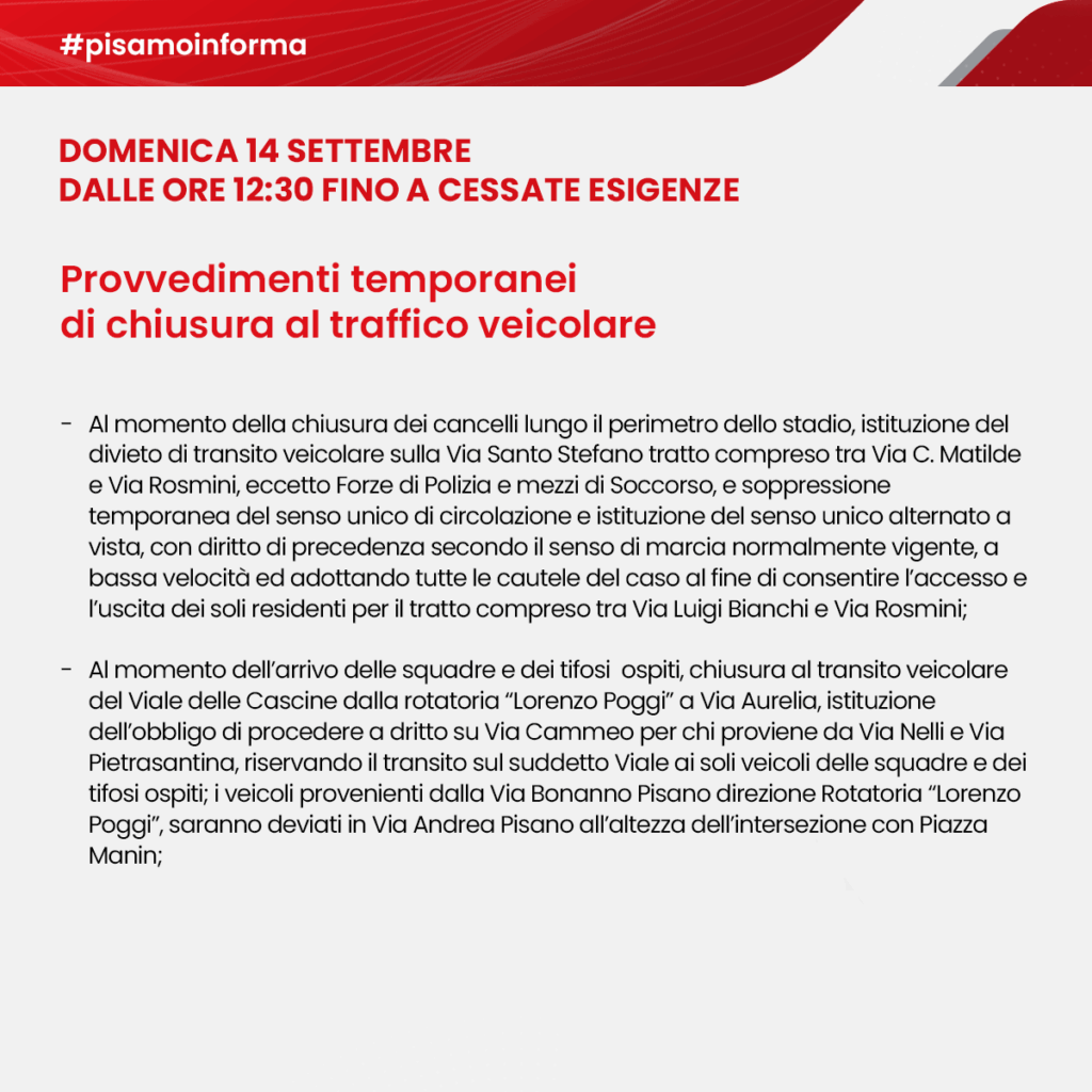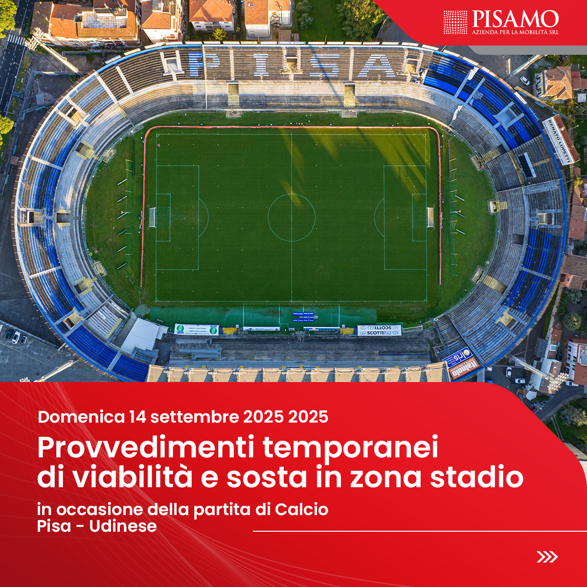 Domenica 14 settembre – Provvedimenti temporanei di viabilità e sosta in zona stadio in occasione della partita di calcio Pisa – Udinese
