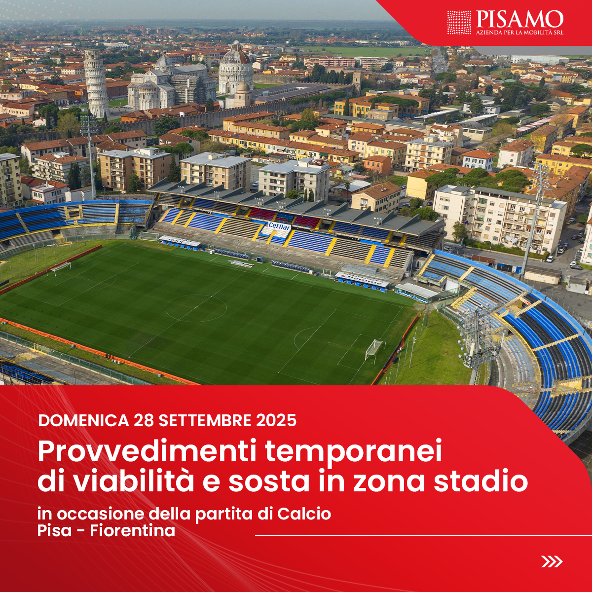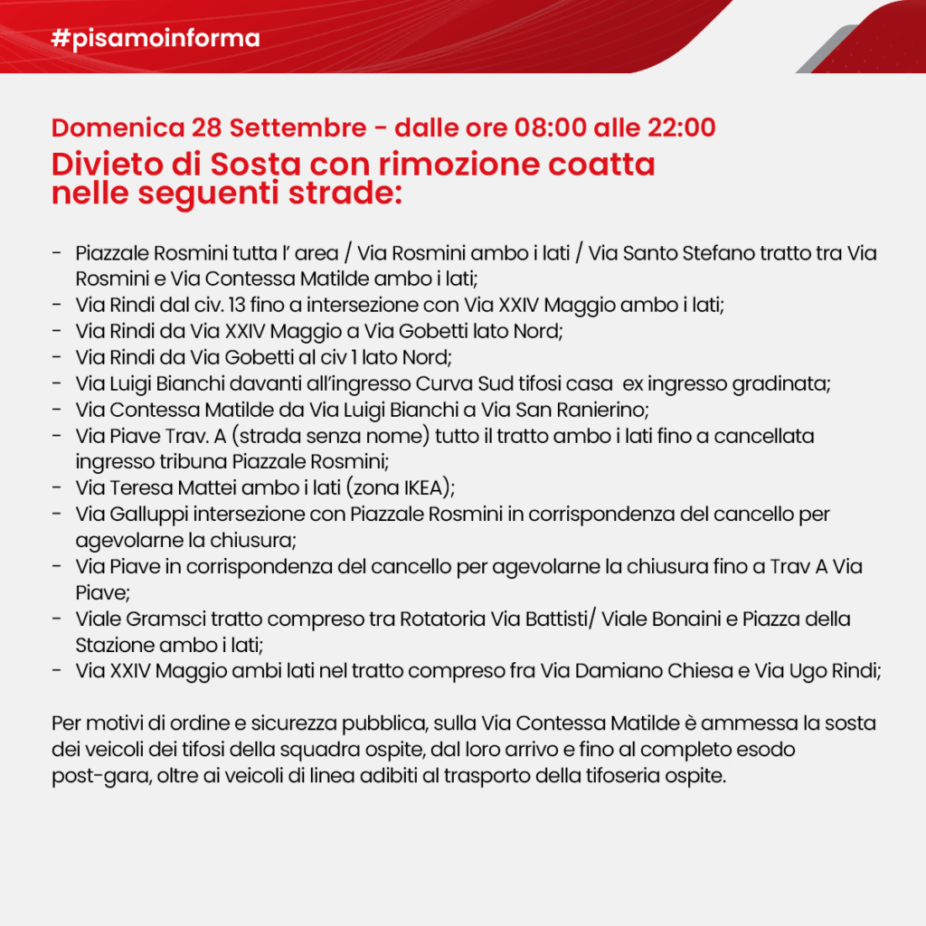 DOMENICA 28 SETTEMBRE 2025 – PROVVEDIMENTI TEMPORANEI DI VIABILITA’ E SOSTA IN ZONA STADIO IN OCCASIONE DELLA PARTITA DI CALCIO PISA – FIORENTINA